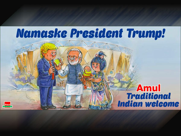 ২৪ এবং ২৫ ফেব্রুয়ারি স্ত্রী মেলানিয়া ট্রাম্প-কে নিয়ে দু'দিনের ভারত সফরে এসেছিলেন মার্কিন প্রেসিডেন্ট ডোনাল্ড ট্রাম্প। ট্রাম্পকে স্বাগত জানাতে বিমানবন্দরে হাজির ছিলেন স্বয়ং প্রধানমন্ত্রী নরেন্দ্র মোদি। এই নিয়েই মজার ছবি তৈরি করল আমূল ইন্ডিয়া। আমদাবাদের মতেরা স্টেডিয়ামে ট্রাম্পকে নিয়ে যে অনুষ্ঠান আয়োজিত হয়েছিল, তার নাম ছিল 'নমস্তে ট্রাম্প'। সেটাকেই অন্যরকম করে আমূল ইন্ডিয়া লিখেছে, 'নমস্কে প্রেসিডেন্ট ট্রাম্প'!