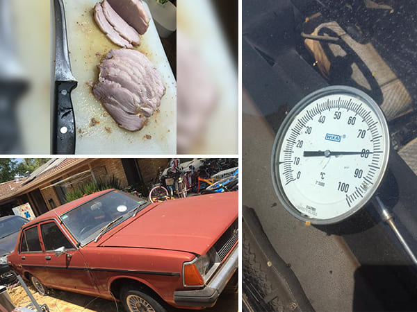 অস্ট্রেলিয়ার পার্থের বাসিন্দা স্টু পেঙ্গেলি। তিনি তাঁর ফেসবুকে একটি ছবি পোস্ট করেছেন, যেখানে দেখা যাচ্ছে তাঁর পুরানো 'ডাটসান সানি' গাড়ি থেকে মাংস রান্না হয়ে বেরোচ্ছে। রান্না করা মাংস তিনি কেটে ছবিতে দেখিয়েছেন।
